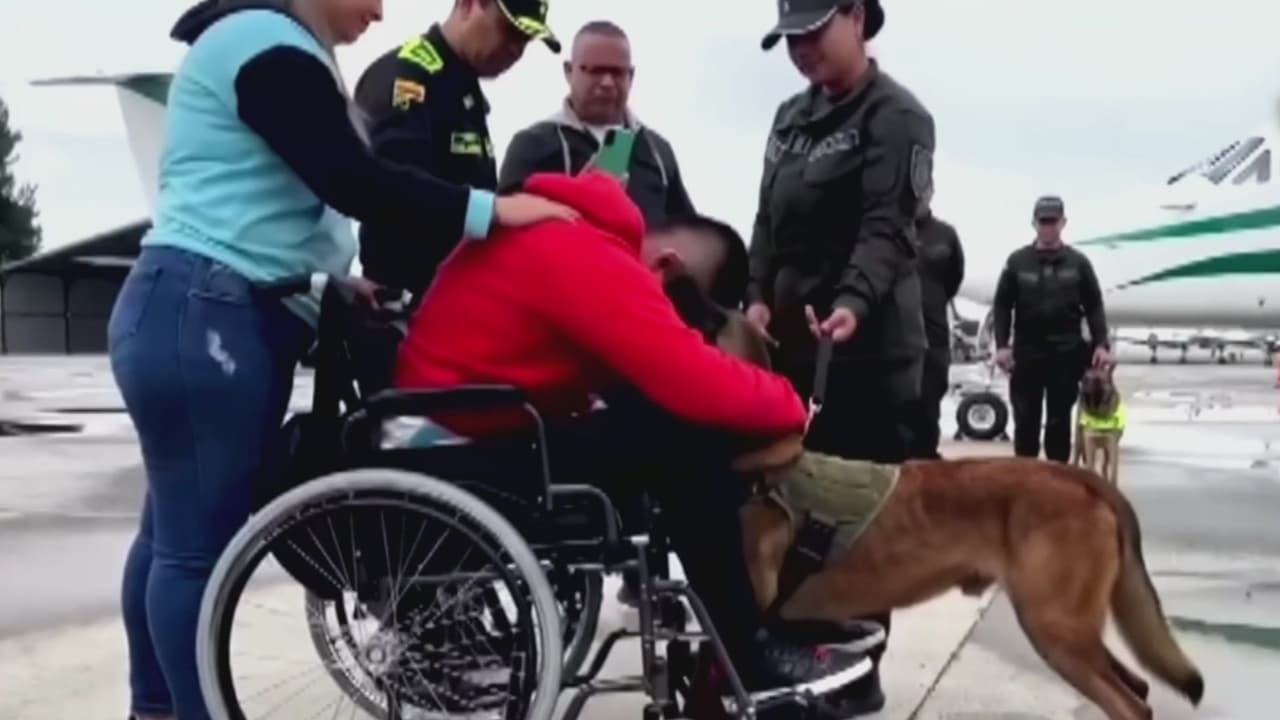 El patrullero Diego Herrera y su perro antinarcóticos 'Telmo' volvieron a reunirse dos meses después del ataque guerrillero a un helicóptero de la Policía en Antioquia, Colombia, que dejó 13 agentes muertos. El uniformado, único sobreviviente del atentado, se salvó porque a última hora cambió de puesto con un compañero. A 'Telmo' todos lo daban por muerto, pero su amo nunca perdió la esperanza de volverse a encontrar con su leal compañero.