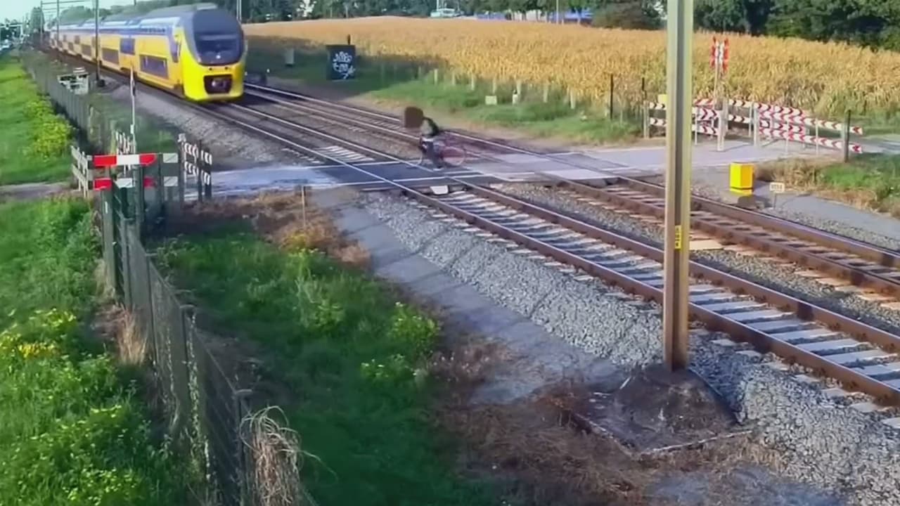 El escalofriante momento ocurrió en los Países Bajos y las autoridades revelaron el video para alertar sobre el peligro de no tomar precauciones al cruzar las vías del tren.
