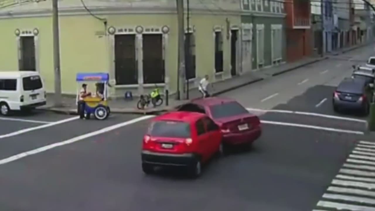 Dos hombre y una mujer estaban de pie en una calle cuando dos autos chocaron frente a ellos. Los vehículos salieron disparados y por poco los atropellan.