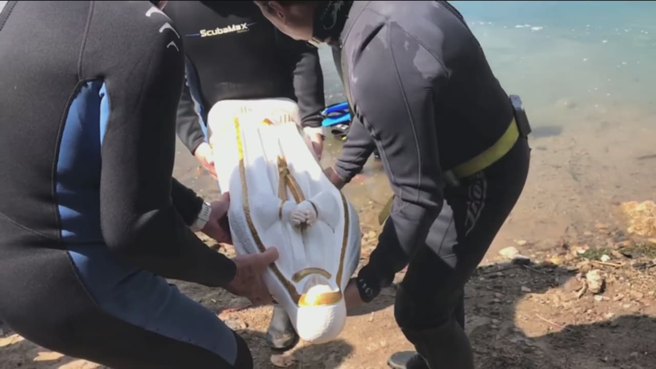 Un grupo de buceadores hundió la imagen de esta virgen en una laguna de Guatemala para fortalecer la devoción por la imagen. Aseguran que en los próximos días montarán un altar submarino mucho más llamativo para que los devotos puedan llevar sus ofrendas.