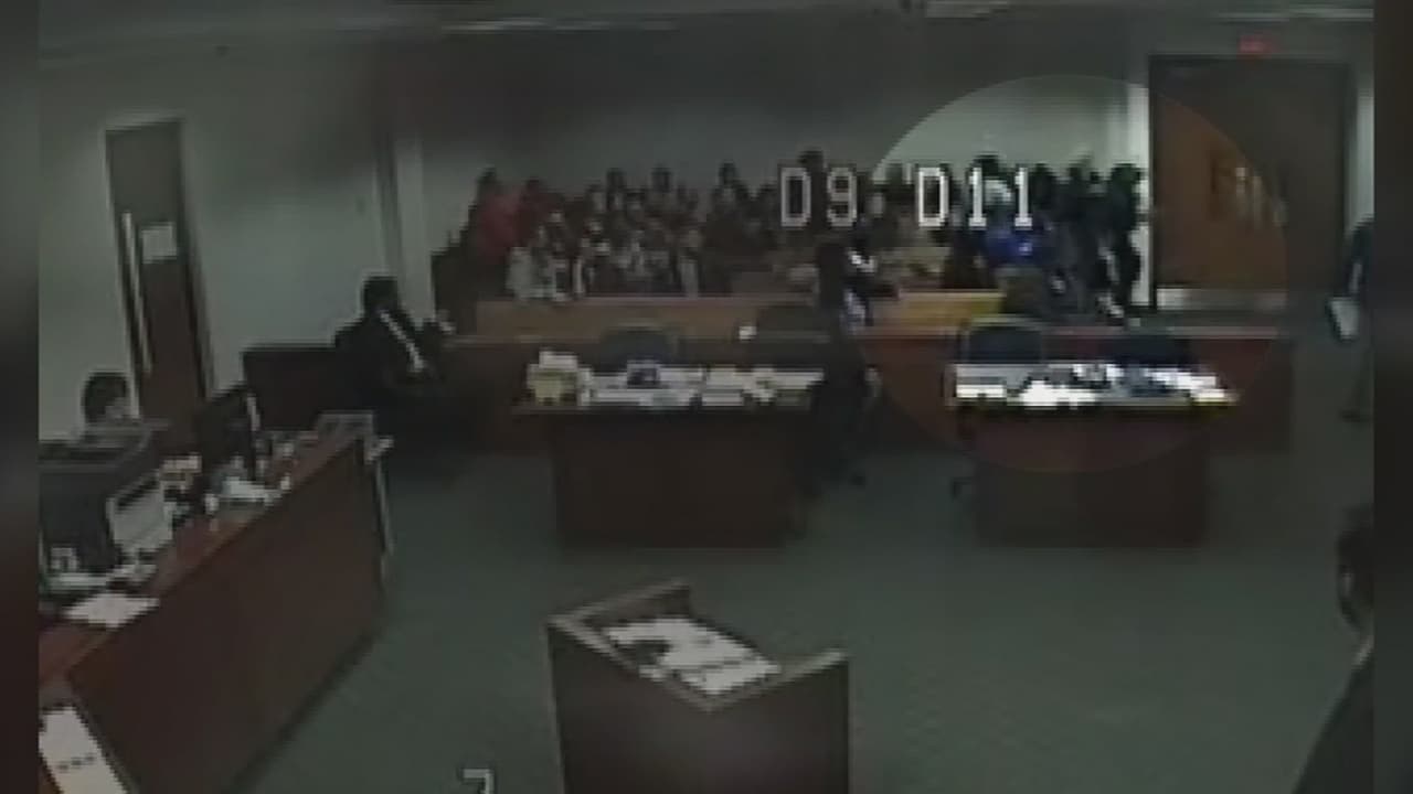 Dos mujeres fueron sacadas a la fuerza de una corte cuando una de ellas se negó a acercarse al podio para que le presentaran cargos, mientras la otra no dejaba de filmar con su teléfono celular, aunque le ordenaron que lo apagara.