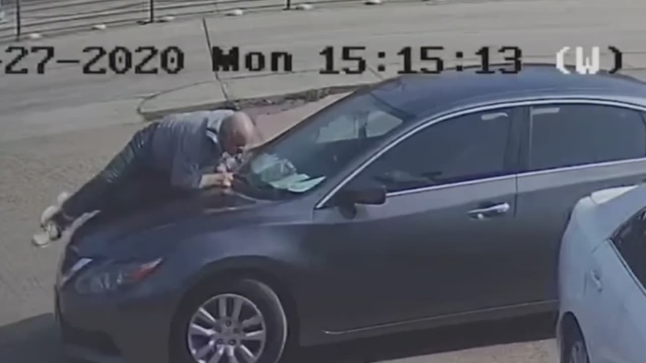 Repartidor de comida intenta detener a un fugitivo, pero el delincuente le lanza el auto encima