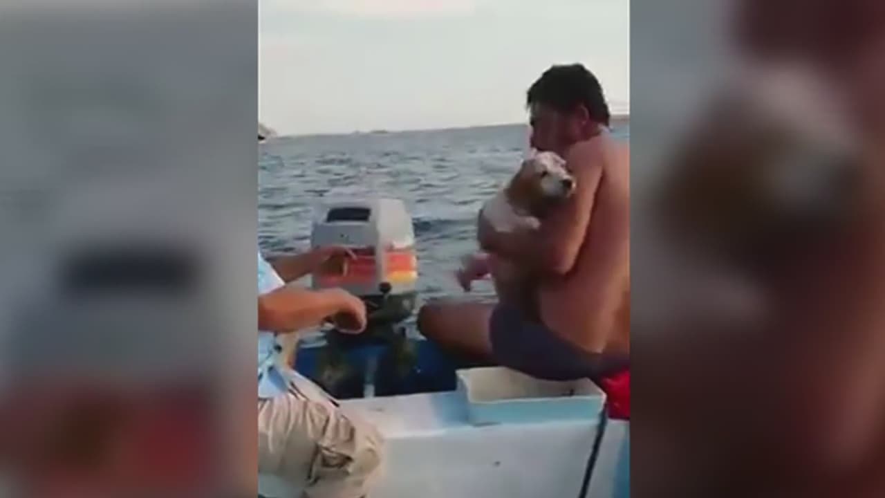 Dos pescadores vieron a la mascota que apenas tenía fuerzas para nadar y lo subieron a su bote. La gran pregunta es cómo llegó a ese lugar.