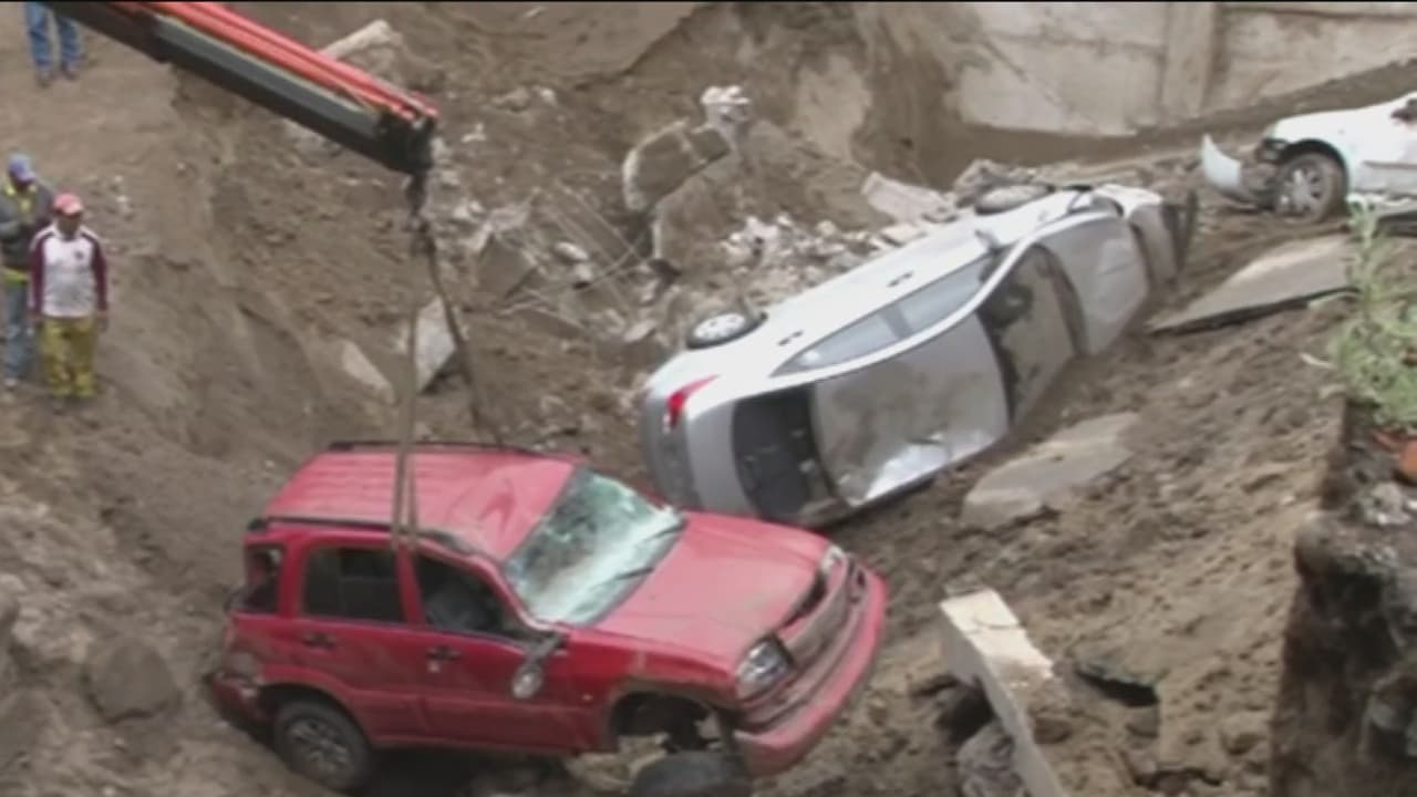 Las incesantes lluvias también causaron un enorme agujero que se abrió en el estacionamiento de un edificio. Los vehículos afectados fueron sacados con grúas.