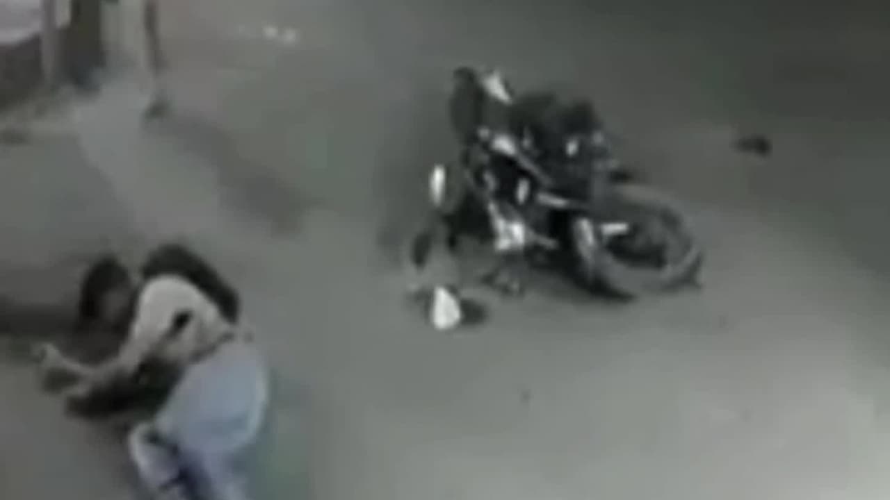Un motociclista voló por el aire al chocar contra un auto. Cayó al piso y la rueda del vehículo le pasó por encima de la cabeza. Milagrosamente, sobrevivió al golpe.