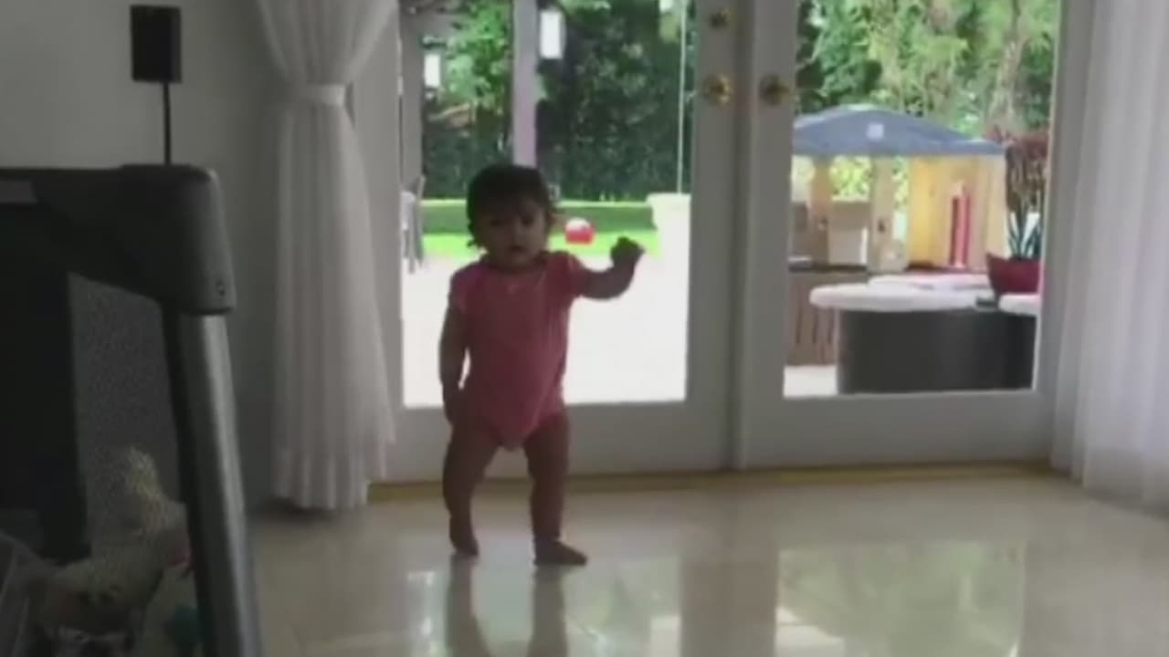 Vestida muy coqueta, la pequeña se prepara como si se tratara de una carrera para mostrar en cámara su primera caminata.