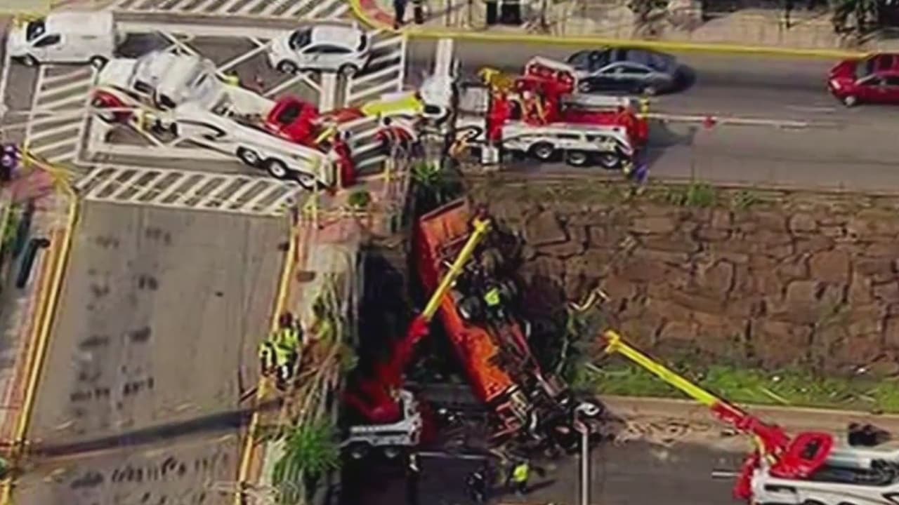 Un camión de basura cayó por un puente y aplastó un autobús de pasajeros