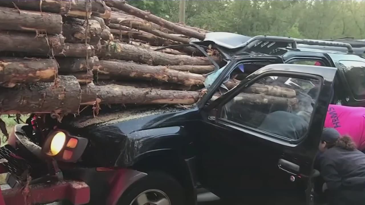 Un despiste le hizo chocar contra un camión repleto de árboles y a la vez le salvó la vida