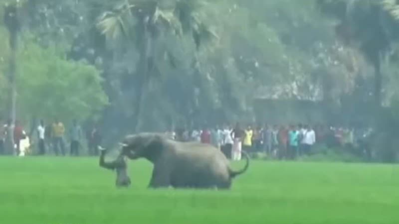 Un grupo de testigos miran impotentes cómo el hombre muere bajo las patas del animal, sin poder intervenir.