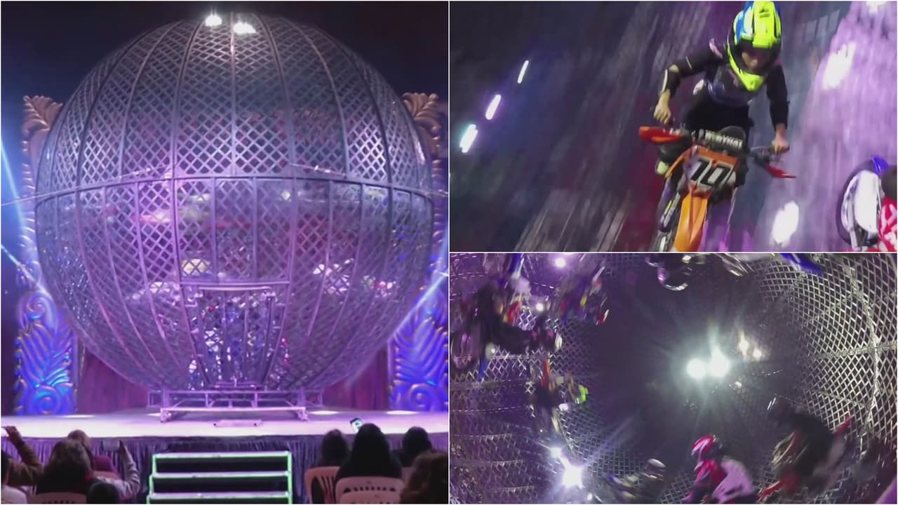 El espectáculo se llama el "globo de la muerte" porque los motoristas ingresan en una esfera de hierro y circulan en sus paredes. Aquella noche algo salió mal y el accidente casi le cuesta la vida a uno de ellos.