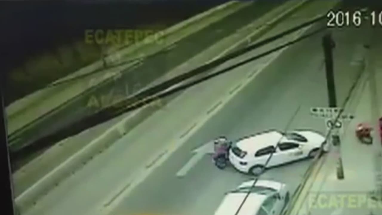 La cámara de un edificio captó el momento cuando un auto se detiene en medio de la vía y la moto donde viajan los dos menores se estrella contra el vehículo, caen sobre el pavimento y un enorme camión de carga les pasa por encima.