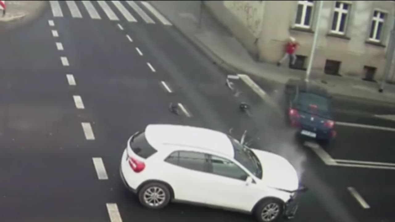 Un poste la salvó de ser atropellada por un auto en Polonia