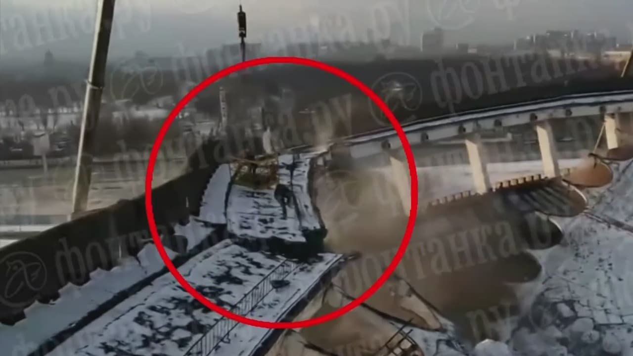 En video quedó grabado el instante en que el techo de la estructura colapsa y el trabajador corre a la plataforma de un compañero para salvarse. El sujeto cayó al vació entre los escombros.