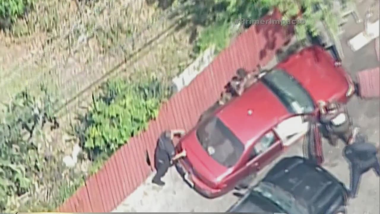 El sospechoso de asesinato intenta escapar dando marcha atrás y casi le pasa por encima a dos oficiales y a sus perros.