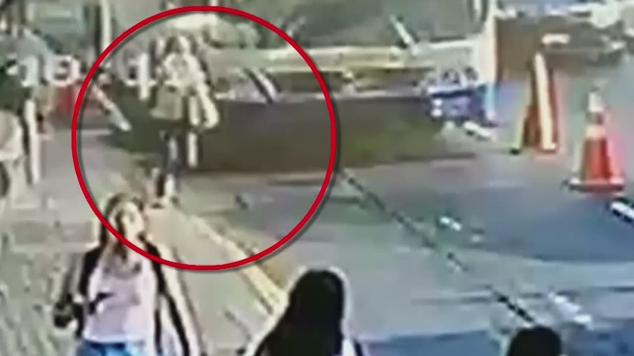 Mujer cruzó la calle de espaldas al tráfico sin darse cuenta de que un autobús se le echaba encima