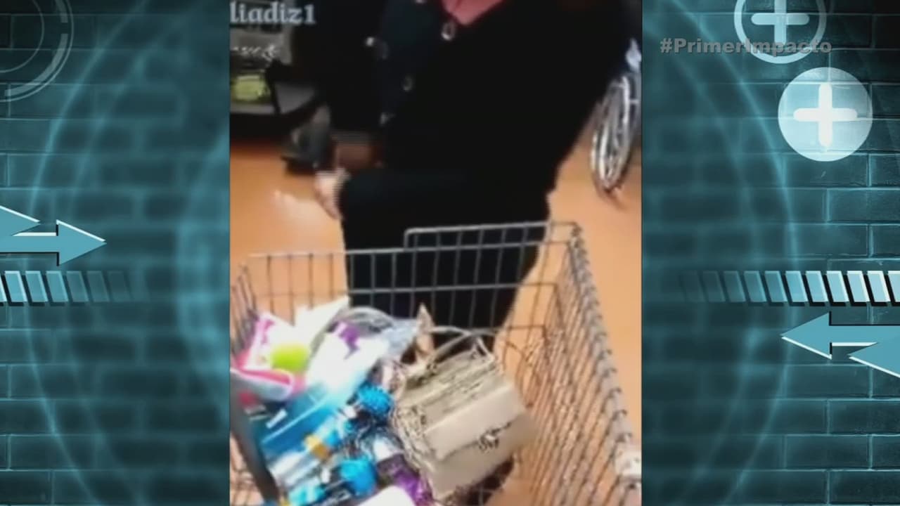 Durante más de un minuto que dura el video no deja de sacarse productos de debajo de su ropa.