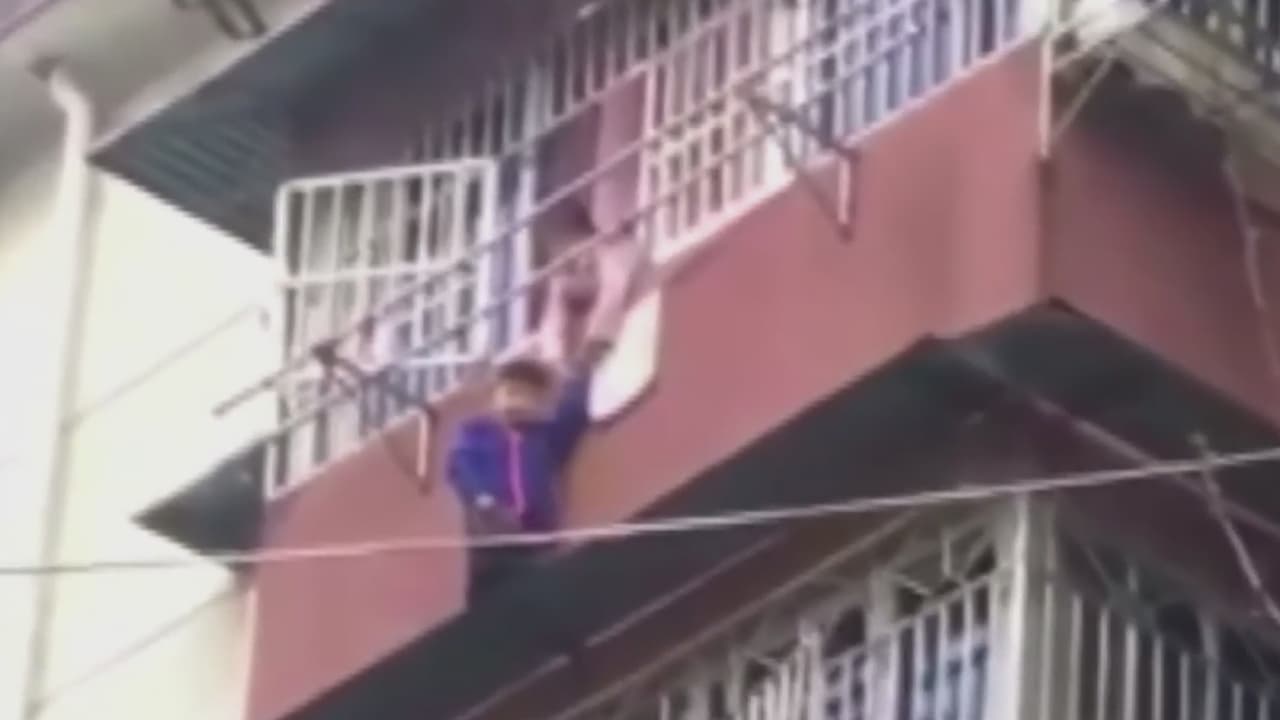 Una niña sostiene a su hermano desde un balcón y lo salva de caer al vacío