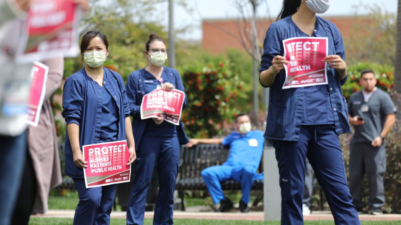 Enfermeras en California están saliendo a la hora de su almuerzo para protestar contra la falta de fondos, la reapertura de los estados y la falta de atención de las personas ante la gravedad de la pandemia, dicen.