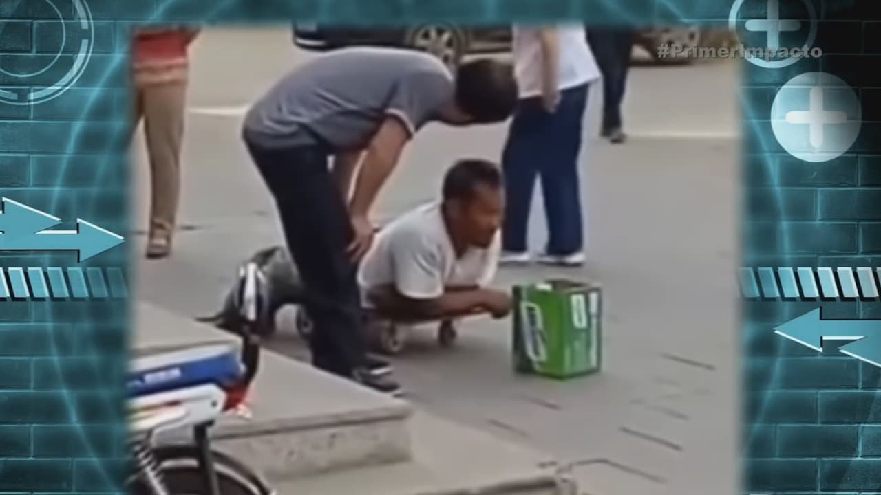 Un hombre dejó al descubierto el truco que el vagabundo utilizaba para pedir limosnas en una concurrida calle de China.