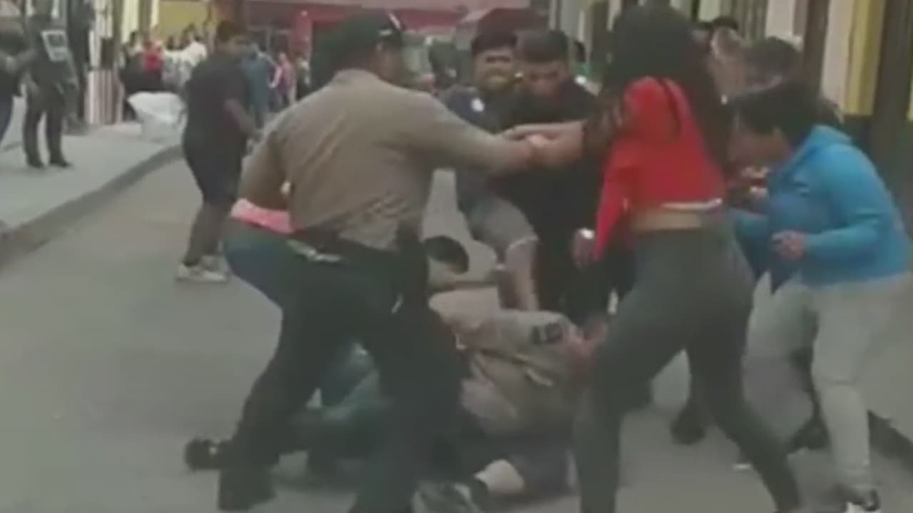 La violenta pelea tuvo lugar en Perú y el supuesto delincuente logró escapar, mientras que uno de los agentes cayó quedó tendido en el piso.