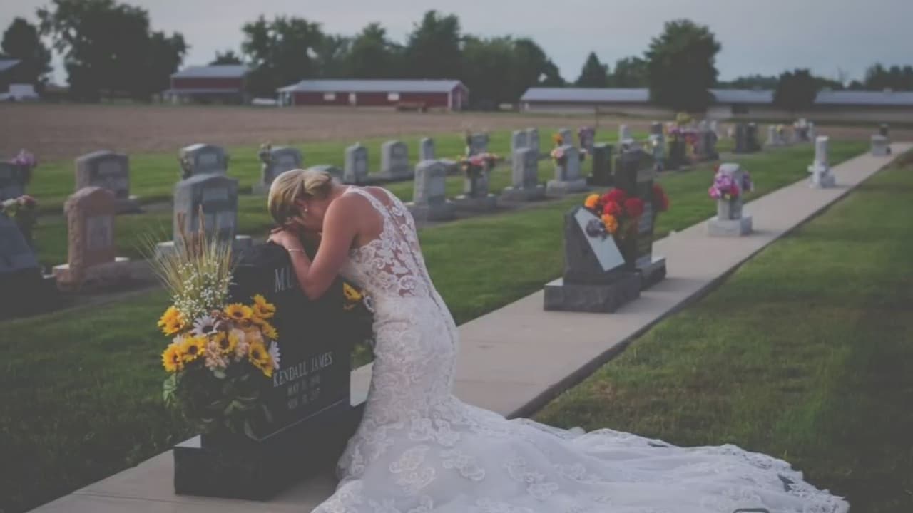 Vestida de novia, esta mujer llora sobre la tumba de su prometido el mismo día que tenían planeado casarse
