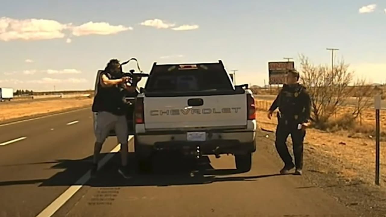 Un video publicado por el la Policía Estatal de Nuevo México, muestra a Omar Félix Cueva, de 39 años, ser detenido en la carretera, salir de su camioneta con su rifle estilo AR-15 y abrir fuego contra el oficial Darian Jarrott, quien intentaba resguardarse en la parte trasera de su vehículo, aunque fue alcanzado por las balas. Antes de huir del lugar, Cueva se acercó hasta donde estaba el policía herido y le disparó a quemarropa.
