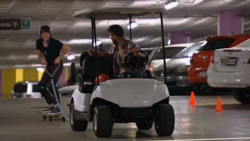 Un reto bastante original: Ski Urbano con un carrito de golf y una patineta. ¿Pee Wee se habrá robado el show?