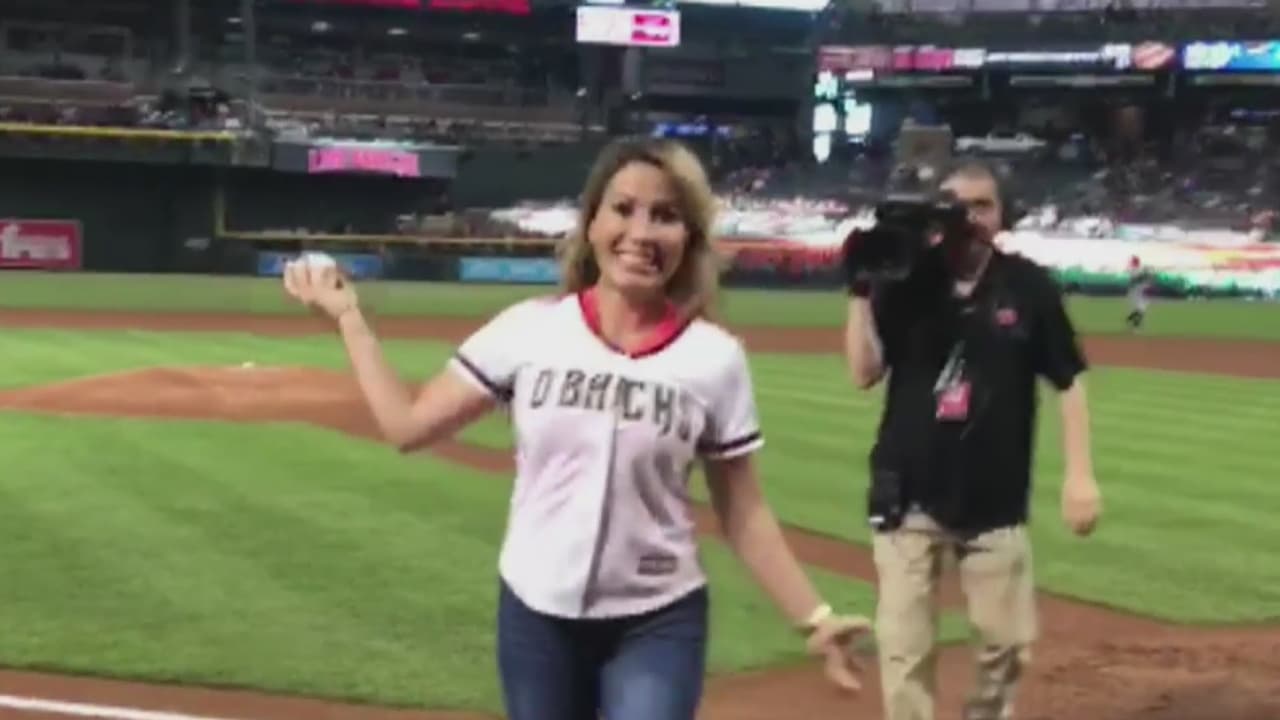 ¡Toda una pitcher! Lindsay Casinelli hizo un lanzamiento previo a un partido de la MLB