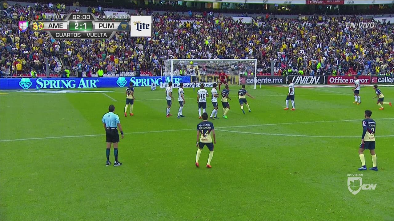 El volante de Pumas David Cabrera sacó un disparo de cobro de tiro libre de Joe Corona, que amenazaba con ser el 3-1.