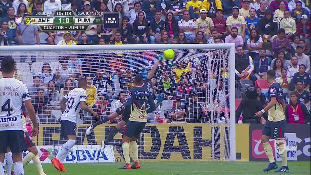 El chileno Marcelo Díaz prendió un balón desde fuera del área que quedó a poco de ser el primer gol de Pumas, pero el portero de América atajó el peligroso disparo.