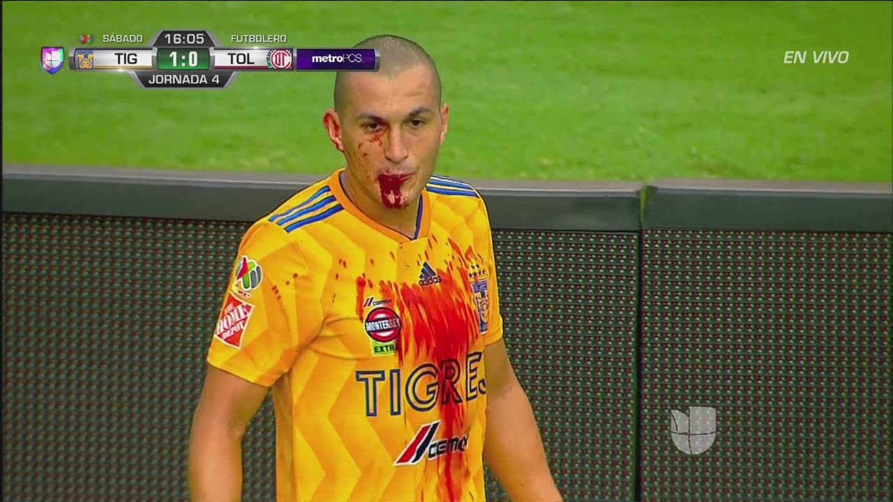 El defensa de los Tigres cometió falta, pero Triverio le dio un codazo que le provocó una herida muy grande en la boca y le llenó de sangre la cara.