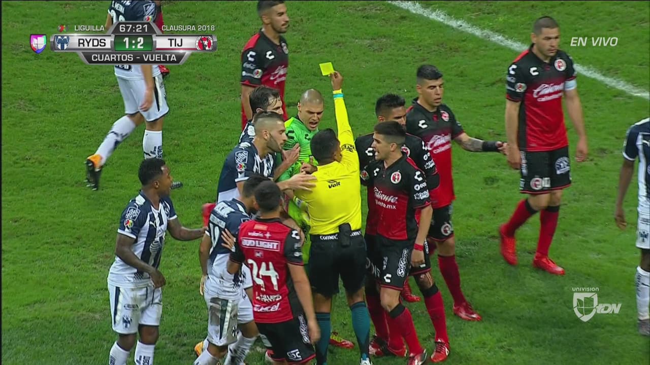 Un conato de bronca se desató previo a un cobro de tiro de esquina en favor de Rayados y el árbitro disparó tarjetas amarillas al por mayor.