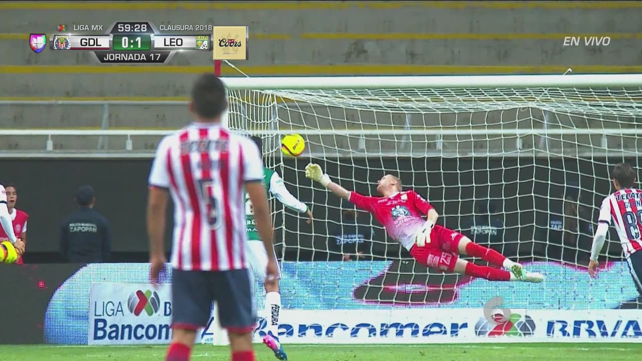 El volante de Chivas metió un gran disparo de pierna zurda que apuntaba al ángulo, pero el portero hizo una gran atajada.