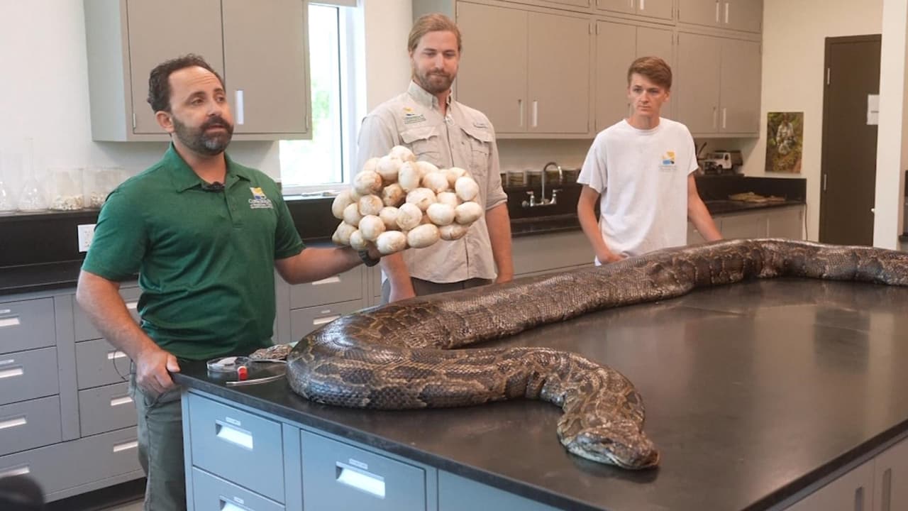A team of biologists last year captured the largest Burmese python ever captured in Florida. The female python weighed in at 215 pounds (98 kilograms), was nearly 18 feet long (5 meters) and had 122 eggs, the Conservancy of Southwest Florida said in a news release.