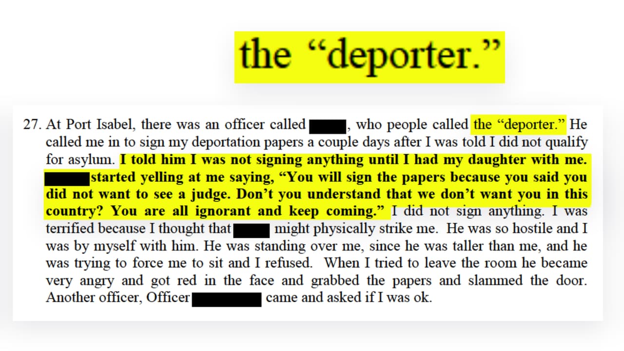 The woman, from the city of San Pedro Sula, described the ICE officer standing over her menacingly and shouting at her to sign. “He called me in to sign my deportation papers a couple days after I was told I did not qualify for asylum,” the woman, who is only identified as D.P., said in a sworn affidavit. “I told him I was not signing anything until I had my daughter with me. (Redacted) started yelling at me saying, ‘You will sign the papers because you said you did not want to see a judge. Don’t you understand that we don’t want you in this country? You are all ignorant and keep coming.’”