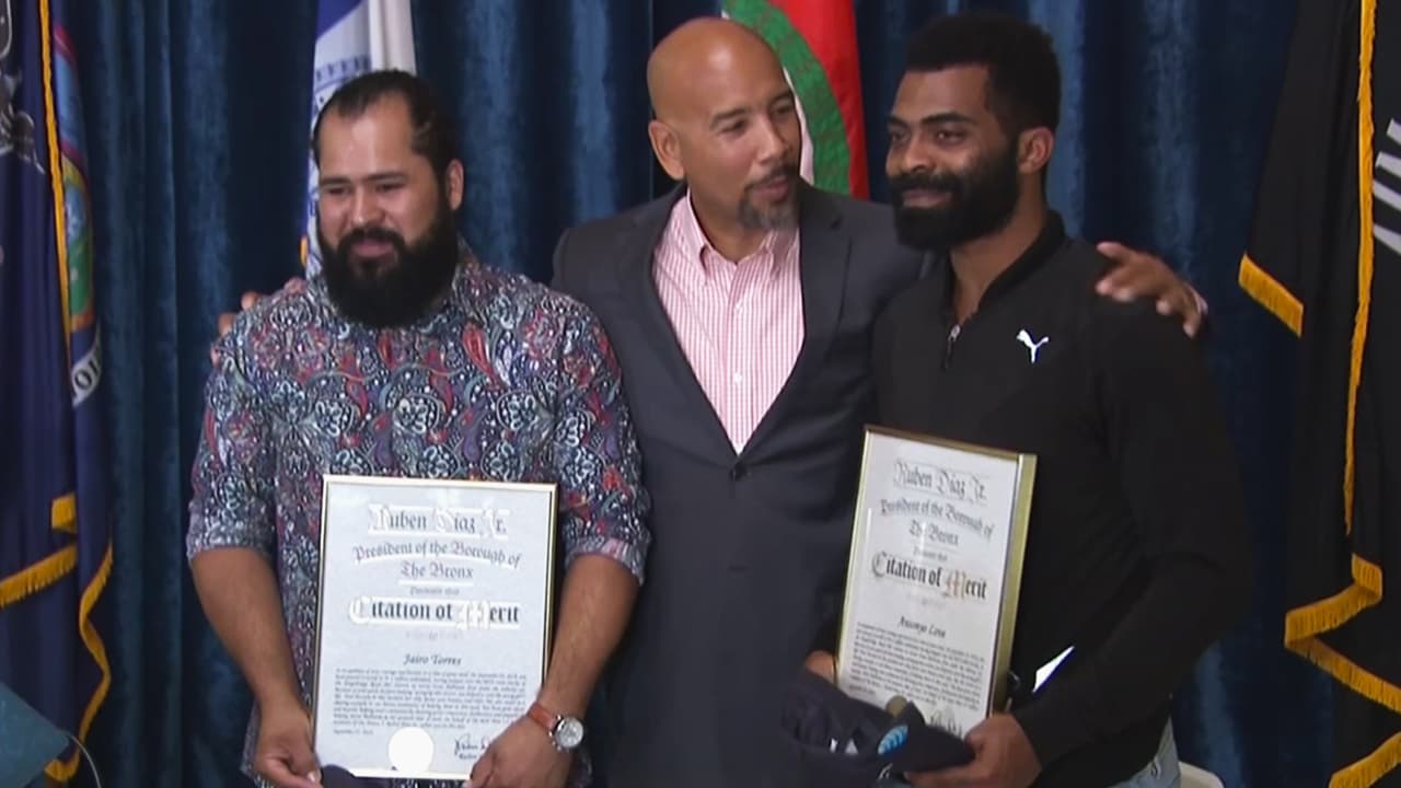 In New York City, the two men who helped save a girl whose father jumped with her in front of a subway train were honored. Nayeli Chavez has the details.