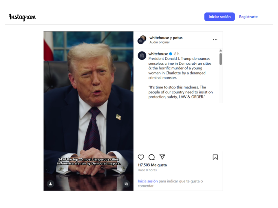 En un video publicado el 9 de septiembre de 2025 en sus redes sociales y en las de la Casa Blanca, el presidente Donald Trump afirmó que “24 de las 25 ciudades más peligrosas en Estados Unidos son gobernadas por alcaldes demócratas”. Sus declaraciones se produjeron en el marco del rechazo por el asesinato de la joven ucraniana Iryna Zarutska, quien recibió una puñalada en el transporte público de Charlotte, Carolina del Norte, por parte de un hombre que había estado 14 veces en la cárcel.